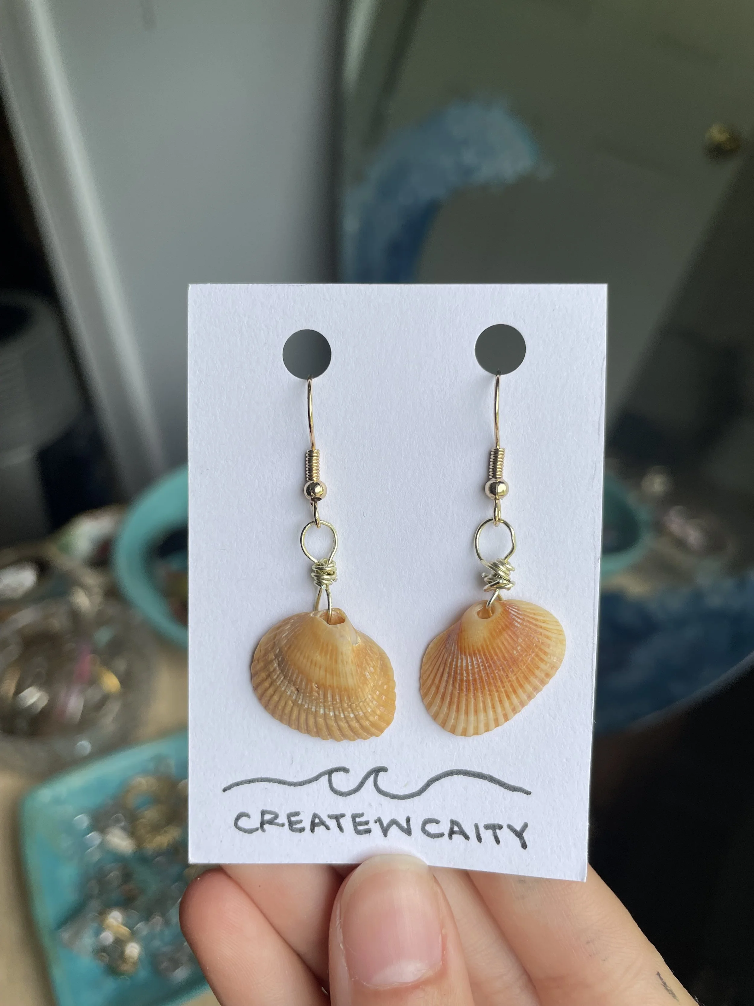 First Collection › Medium Orange Clam & Gold Dangles Image 1 of 1 Medium Orange Clam & Gold Dangles $15.00 sold out Made from shells found at Topsail Beach. Sold Out Added! Made from shells found at Topsail Beach.